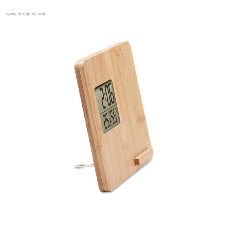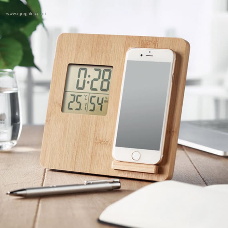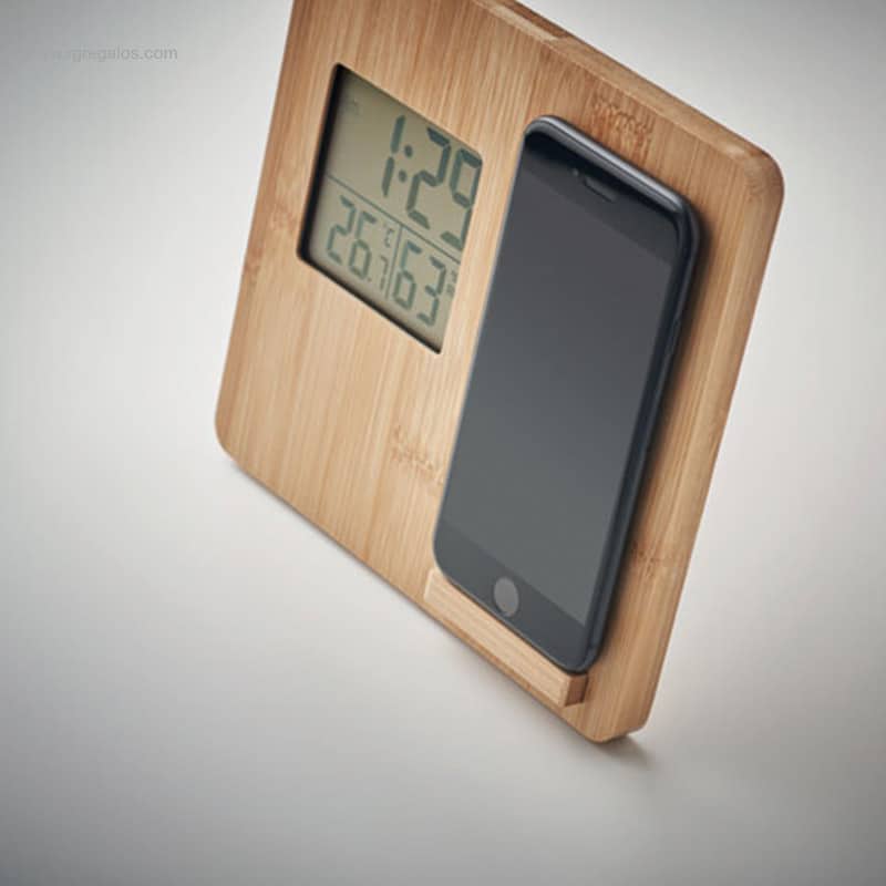 Si busques un regal d’empresa tecnològic, útil i fabricat en materials ecològics, encertaràs amb aquest carregador amb estació meteorològica per personalitzar amb el logotip. Per carregar el teu smartphone de forma sense fil de 10W, aquest original dispositiu inclou visualització de l’hora, la temperatura i la humitat en una pantalla LED, a més de la funció de suport en carcassa de bambú. Inclou 1 CR2032. Sortida sense fil: DC 9V/1.10A (10W) per a una càrrega ràpida. Compatible amb els últims Android, iPhone® 8, X i més recents.