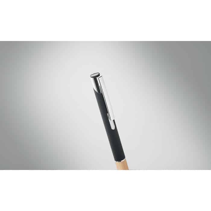 Bolígraf polsador d’ alumini amb empunyadura de bambú. Tinta blava.