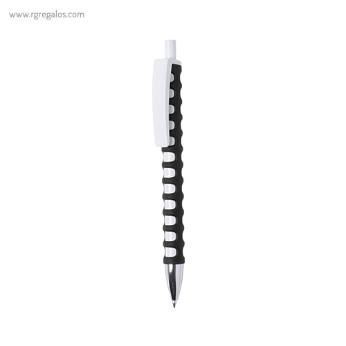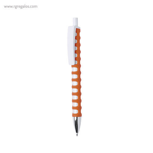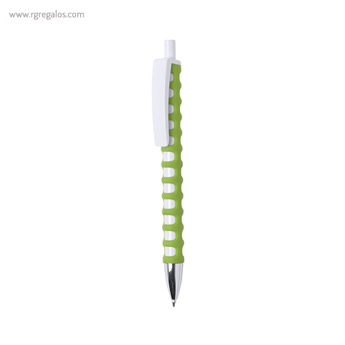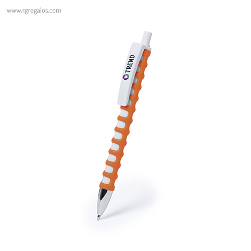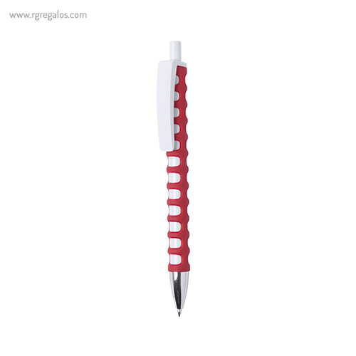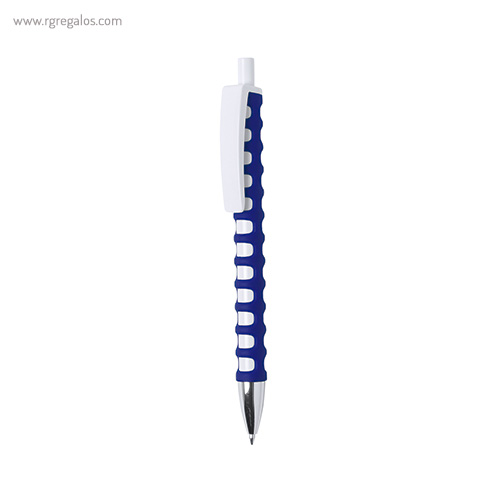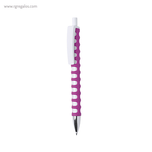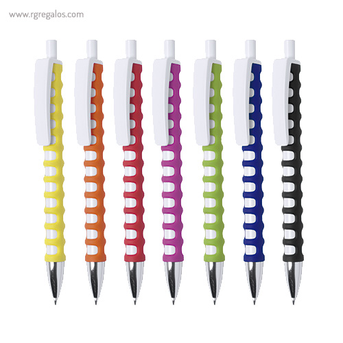 Original bolígrafo de cuerpo troquelado y mecanismo pulsador. Cuerpo troquelado de suave tacto goma en vivos colores. con clip maxi en color blanco para marcaje y punta el color plateado brillante. El logotipo de su empresa brillará con este original bolígrafo. El especial diseño de este bolígrafo le aporta unas características únicas y una adaptación perfecta a la mano.